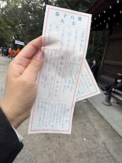 こんばんわ,,>᎑<,, 毎年恒例の大須観音‼️ 今年はそんなに並ばずに参拝できたとおもったけど40分くらいは並んでた〜! おみくじ大吉だった割に厳しいこと書いてあった(笑)(笑) 喜んでいいんだよな?💁♀️(笑) 意志を強く持ってれば不安もあるかもだけど結果オーライらしい🥺🤍 意思強くコツコツ頑張ります‼️ 仕事運どうかなと思ってたから調度良いということですな🧸 コツコツは苦手じゃないのでがんばれそう〜🐌 なんせ、年末年始ですらブログもちゃんと書いてるのまじ偉くね こーゆー所はマメだよなと自分でも思える🫢 それにしても食べすぎてて苦しすぎる〜‼️ 塩分摂りすぎて顔パンパンな気がするよーーーーん😳 では!